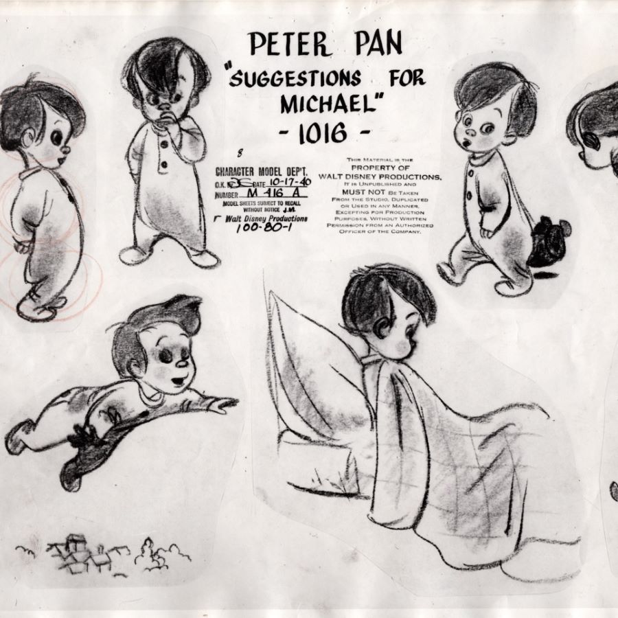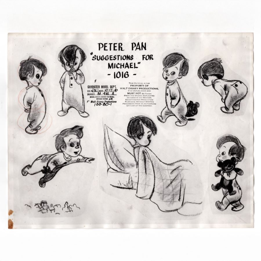 A photostat model sheet from the Walt Disney Studios animated masterpiece "Peter Pan" (1953). Featuring early design concepts for Michael Darling from 1940, the model sheet was created at the studio and used during the animation process to ensure character consistency among animators. Measuring 11”x14” overall, with the image area measuring 9.75”x12.5”, the model sheet is in very good condition with wear from age and handling including discoloration, edge and corner wear, pin holes throughout, stains on the bottom left corner, some soiling on the reverse, and graphite notations on one image of Michael.