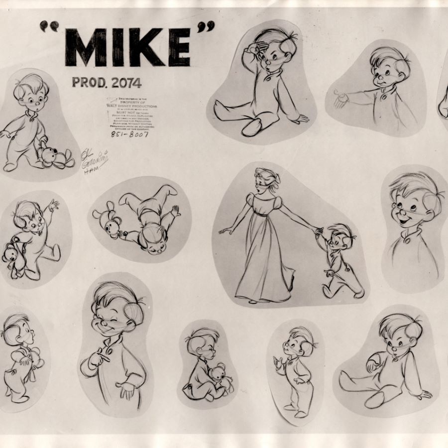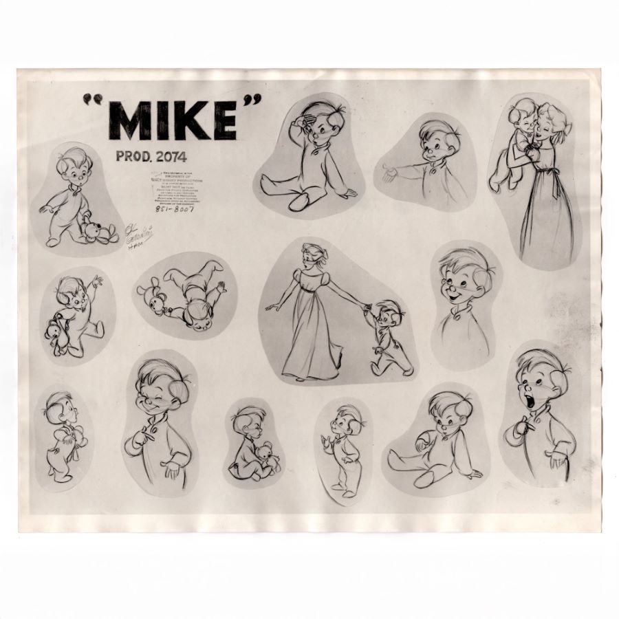 A photostat model sheet from the Walt Disney Studios animated masterpiece "Peter Pan" (1953). Featuring the final clean up designs of Michael Darling and Wendy Darling, the model sheet was created at the studio and used during the animation process to ensure character consistency among animators. Measuring 11”x14” overall, with the image area measuring 9.5”x12.5”, the model sheet is in very good condition with wear from age and handling including discoloration, edge and corner wear, and a staple hole in the top left corner.