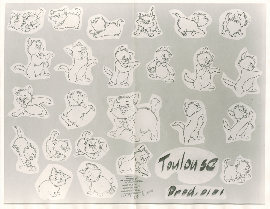 An original photostat model sheet from the Walt Disney Studios animated feature The Aristocats (1970). Featuring Toulouse, the model sheet was created at the studio and used during the animation process. The photostat on paper print was created in the studio and used by animators to ensure consistent character design. Measuring 11"x14" overall, and with the image area measuring about 9.5"x13", the model sheet is in good condition with minor edge wear and a vertical crease from studio use and storage.