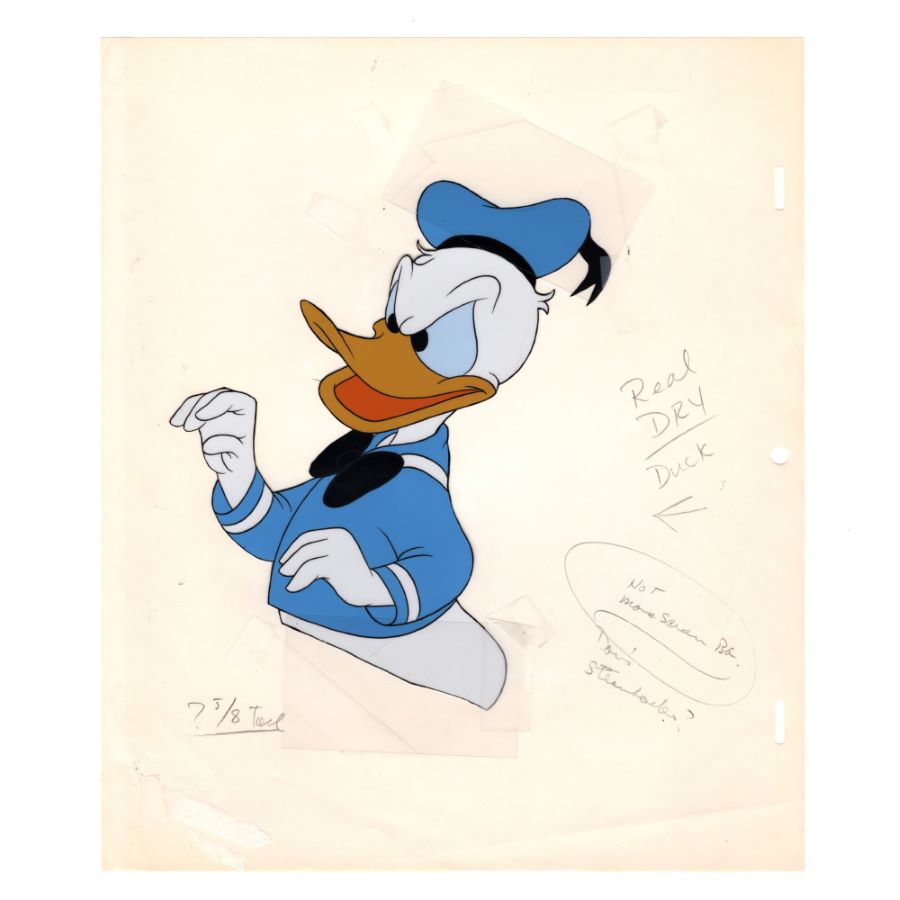A production cel from an unknown 1950s Walt Disney Studios animated film with Donald Duck. Featuring an appropriately grumpy looking Donald, the hand-painted cel was created at the studio and used during the animation process. The character has been trimmed to image and applied to a sheet of animation paper that also has notes regarding the spectacular image of Donald. Measuring 7.75”x6.5” trimmed to image, the cel is in good condition with tape and additional cel material attaching it to a sheet of 12.5”x10.5” animation paper. The cel image shows minor wear including paint cracking and lifting.